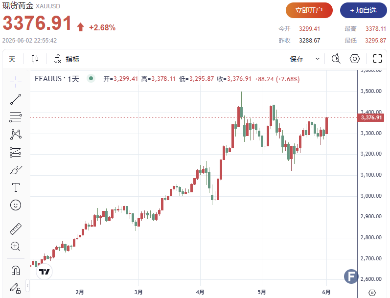 周一(6月2日),黄金价格大幅上涨,创下5月8日以来新高,原因在于美元走软、美中贸易紧张重燃及多重地缘政治与经济不确定性促使投资者涌向避险资产。