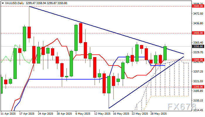 日线技术指标转为全面看涨格局,厚实的日线上升云带(近期多次抵御回调)持续提供支撑,同时,在形成金叉后,日线Tenkan线/Kijun线(转换线/基准线)出现发散,而突破三角形上边界(3343美元)也释放了积极信号。
