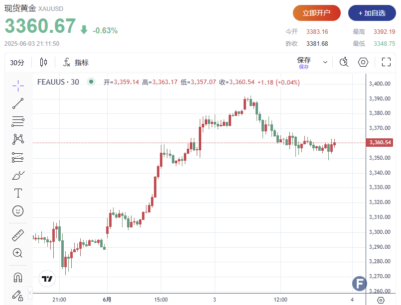 周二(6月3日),现货黄金自盘中四周高位回落,因美元小幅反弹及部分投资者获利了结,压制金价上行空间。与此同时,市场仍对美国贸易政策反复无常保持高度警惕,整体风险情绪趋于谨慎。