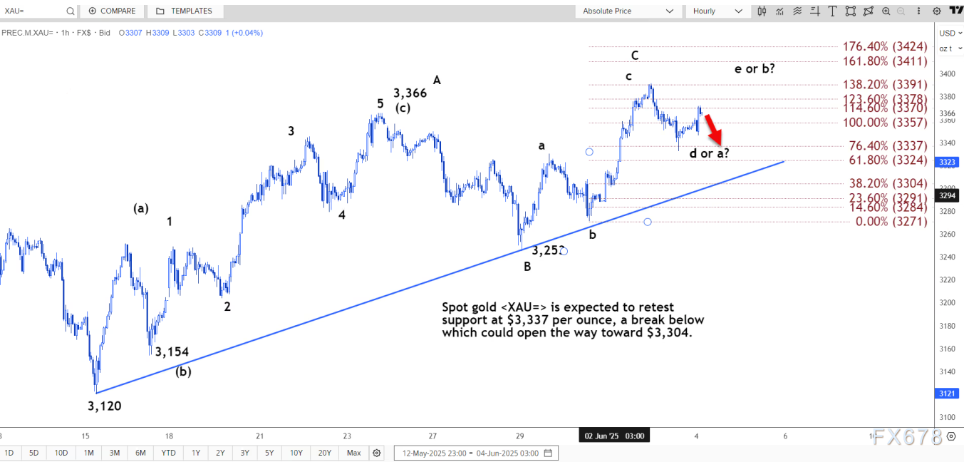 路透技术分析师指出,现货黄金价预计将重新测试每盎司 3337 美元的支撑位,跌破该水平可能打开通往 3304 美元的道路。