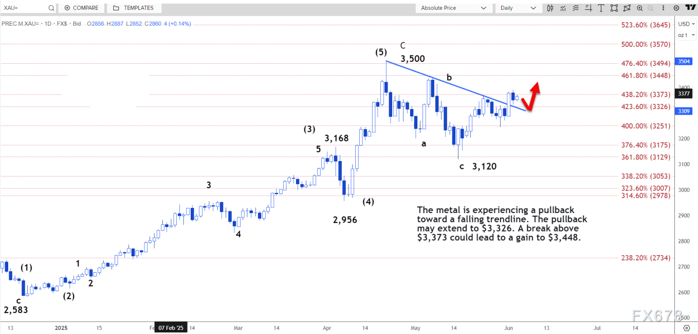 日线图显示,金价正回调至下降趋势线。回调可能延续至3326美元。若突破3373美元,则可能上涨至3448美元。