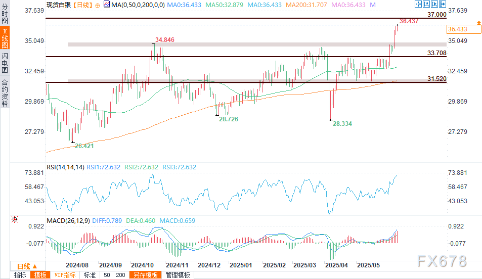 —周一(6月9日),白银价格连续第三个交易日延续涨势,得益于近期突破34.87美元和35.40美元的多年阻力位。随着这些水平成为支撑位,白银表现继续优于黄金,并吸引了看涨资金流入,交易员近期目标瞄准心理关口37.00美元和38.00美元。