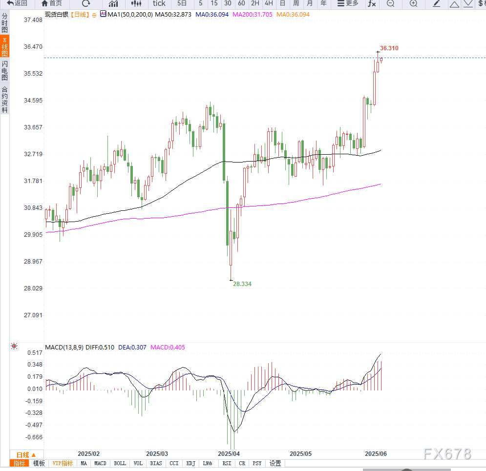 同时,MACD线位于零轴上方并呈现金叉状态,表明趋势延续性良好。若银价成功突破36.50美元的上方阻力,将有望进一步挑战2024年高点37.30美元区域。