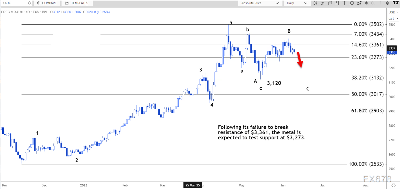 B浪底部3245美元是目标位。50%回撤位3262美元看起来是一个更现实的目标位。突破3337美元后,价格可能上涨至3362美元至3,404美元区间。