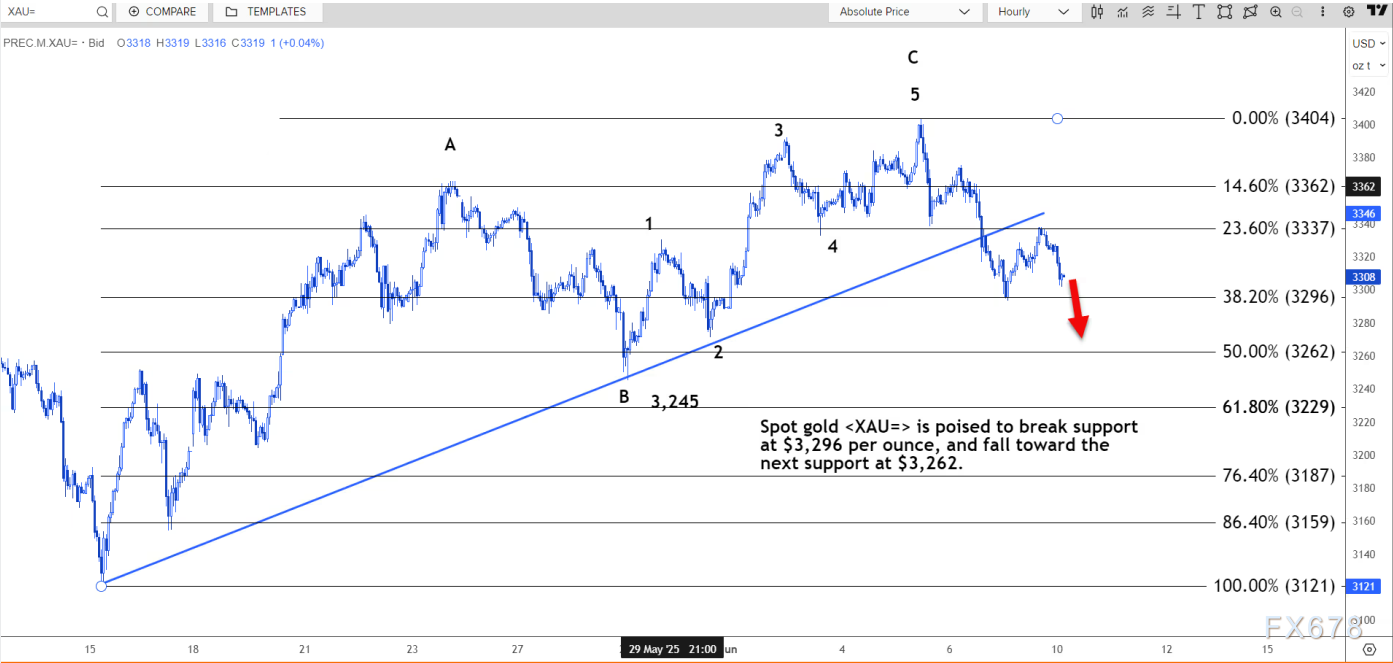 路透技术分析师指出,现货黄金有跌破每盎司 3296 美元的支撑位,并跌向下一支撑位 3262 美元。
