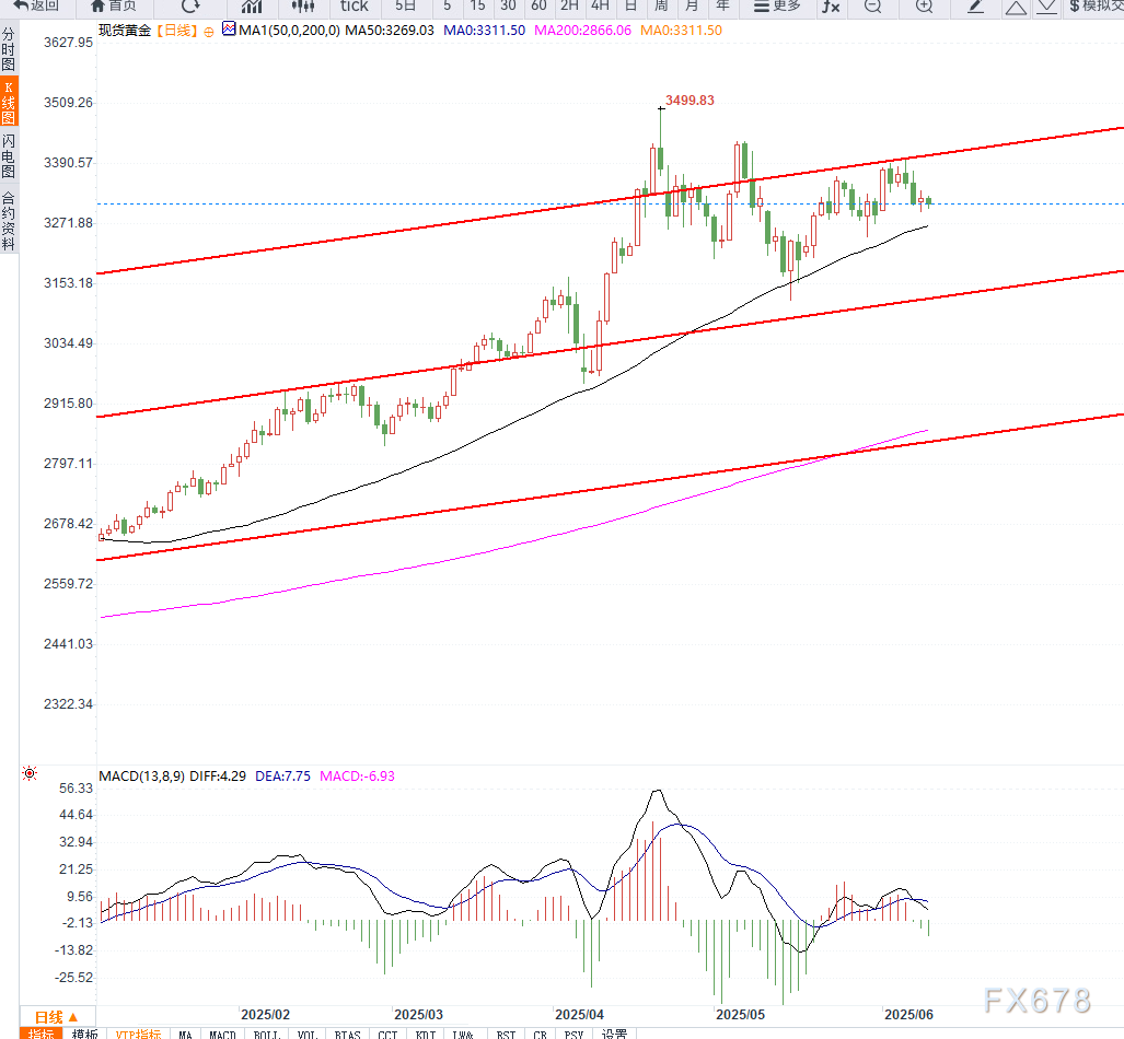 从技术角度看,金价在测试200小时均线未果后再度回落,当前处于3300美元下方震荡。小时图指标(MACD、RSI)显示空头动能持续增强,若价格跌破前一交易日低点3293美元,将进一步打开回落至5月29日低点3245美元甚至3200美元的空间。