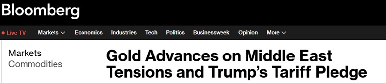 由于中东紧张局势加剧,黄金连续第二天上涨,特朗普表示将在两周内通知贸易伙伴关税税率,这也支持了黄金的避险地位。