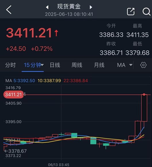 受中东紧张局势影响,现货黄金价格突破3410美元/盎司关口,创5月8日以来新高。金价日内飙升近25美元。