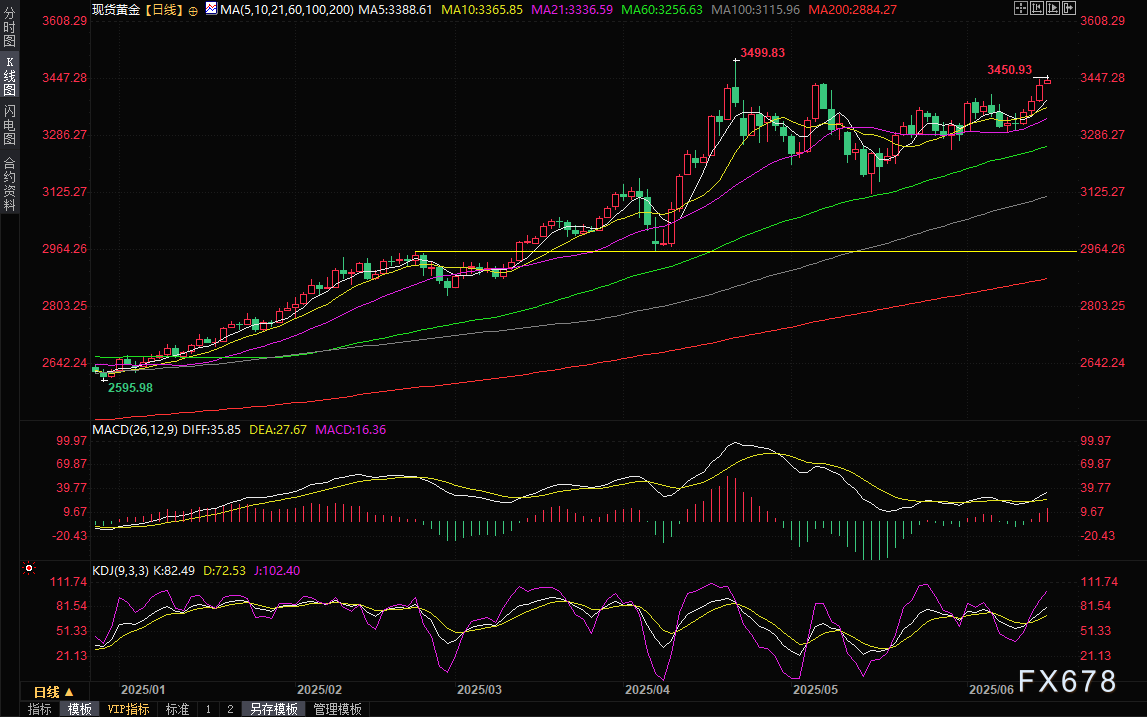 —周一(6月16日)亚市早盘,现货黄金延续上周涨势,一度刷新近七周高点至3450.93美元/盎司,因为以色列和伊朗在周日(6月15日)互相发动新一轮袭击,加剧了市场对战事升级可能引发更广泛地区冲突的担忧,黄金继续获得避险买盘的支撑。