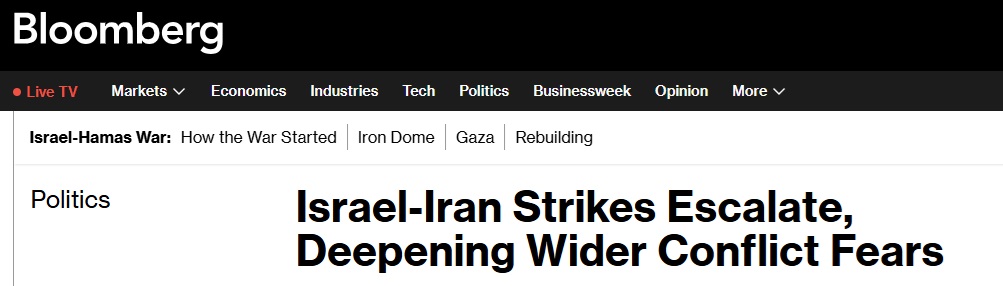 美国彭博社周一(6月16日)称,以色列与伊朗的袭击升级,加剧更广泛的冲突担忧。