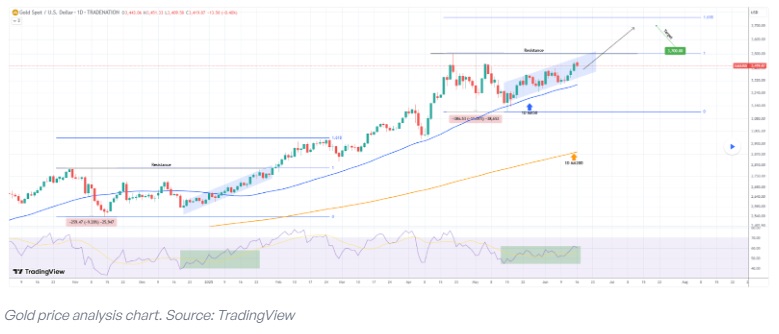 若金价确认突破,尤其是如果金价在50日移动均线(MA50)上方维持强势,可能会加速上涨势头,最终冲向3700美元/盎司大关。