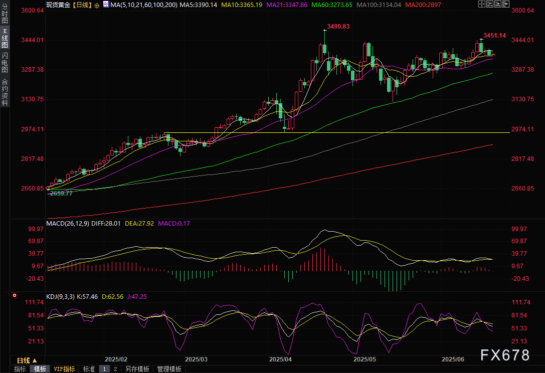 美联储在6月18日的会议中决定将指标隔夜利率维持在4.25%-4.50%不变,这一决定符合市场预期,但其后续的表态却为黄金市场带来了新的不确定性。美联储主席鲍威尔在新闻发布会上明确表示,尽管今年仍预计降息50个基点,但未来降息步伐将明显放缓,2026年和2027年预计每年仅降息25个基点。鲍威尔强调,美联储目前处于“良好位置”,可以继续观察经济数据,尤其是通胀数据的表现,以决定未来的政策调整。这一谨慎的立场削弱了市场对美联储快速宽松的预期,导致金价在周三下跌0.57%,收报3369.22美元/盎司。