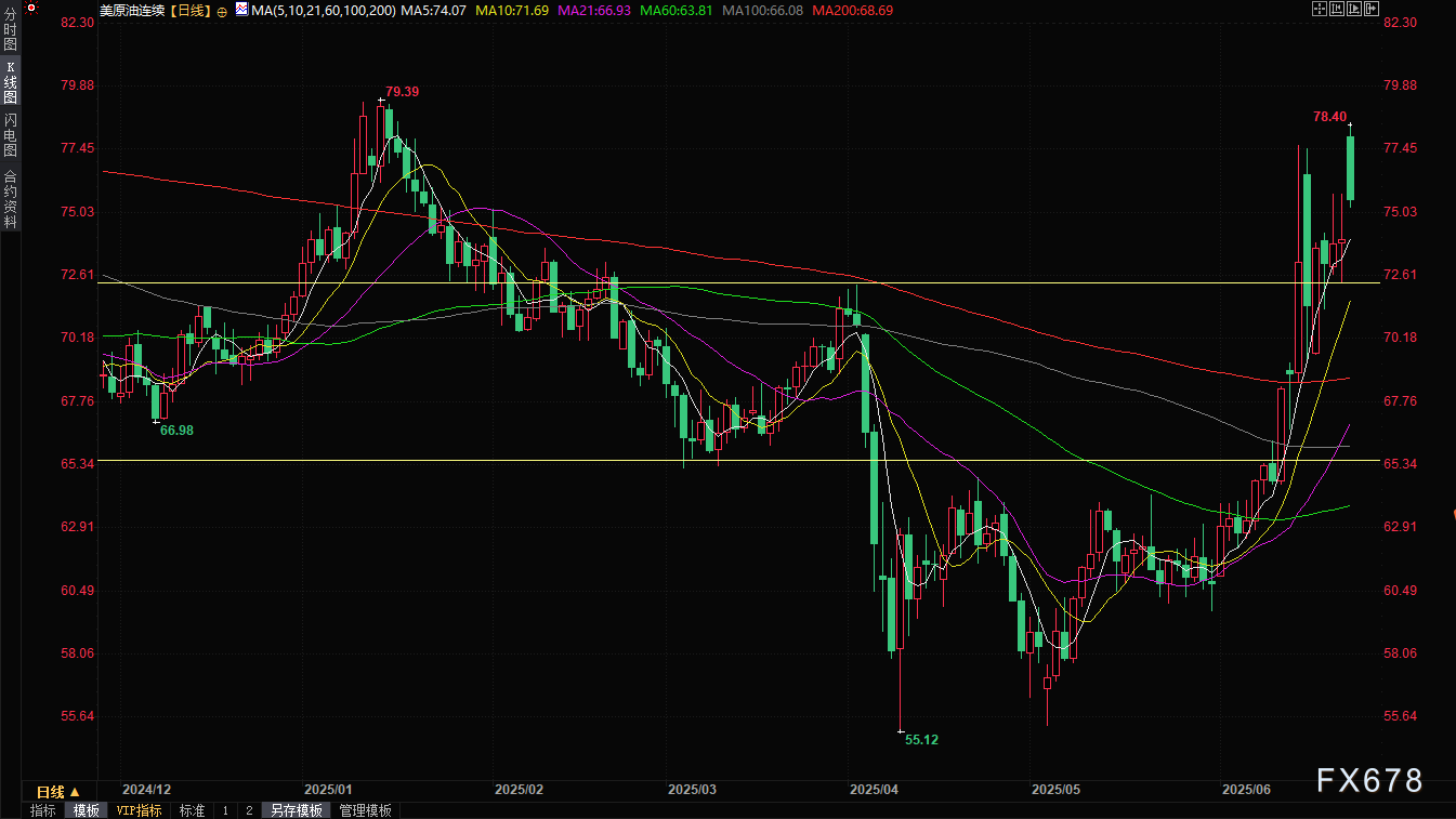 受避险情绪推动,周一亚市早盘,现货黄金一度跳涨近30美元(0.8%),触及3396.70美元/盎司,随后震荡回落至3375.62美元/盎司,涨幅收窄至0.2%。美原油价格盘初飙升6%,达到78.40美元/桶,创1月17日以来新高,但目前回落至75.75美元/桶附近,涨幅收窄至2.5%。投资者担忧中东局势升级可能推高能源价格,进而加剧全球通胀压力。