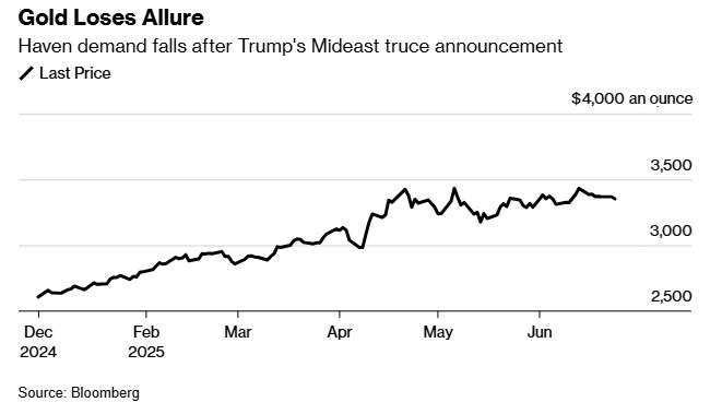 周二(6月24日)亚市早盘,现货黄金加速下滑,伊朗官员刚刚证实,伊朗已接受美国总统特朗普提出的与以色列停火方案。美国彭博社称,黄金因避险需求减弱而回落。