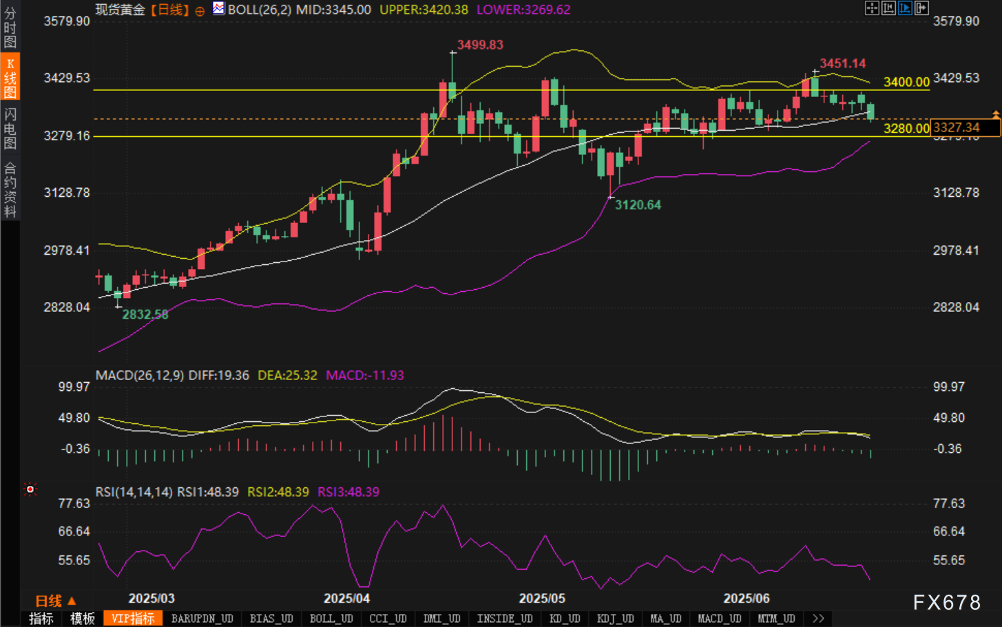 日线图上,黄金价格已连续多日运行于布林带中轨与上轨之间,但分析认为近期反弹动能减弱,或向下测试3280美元区域支撑;上方阻力关注前高3451美元及3400美元心理关口。
