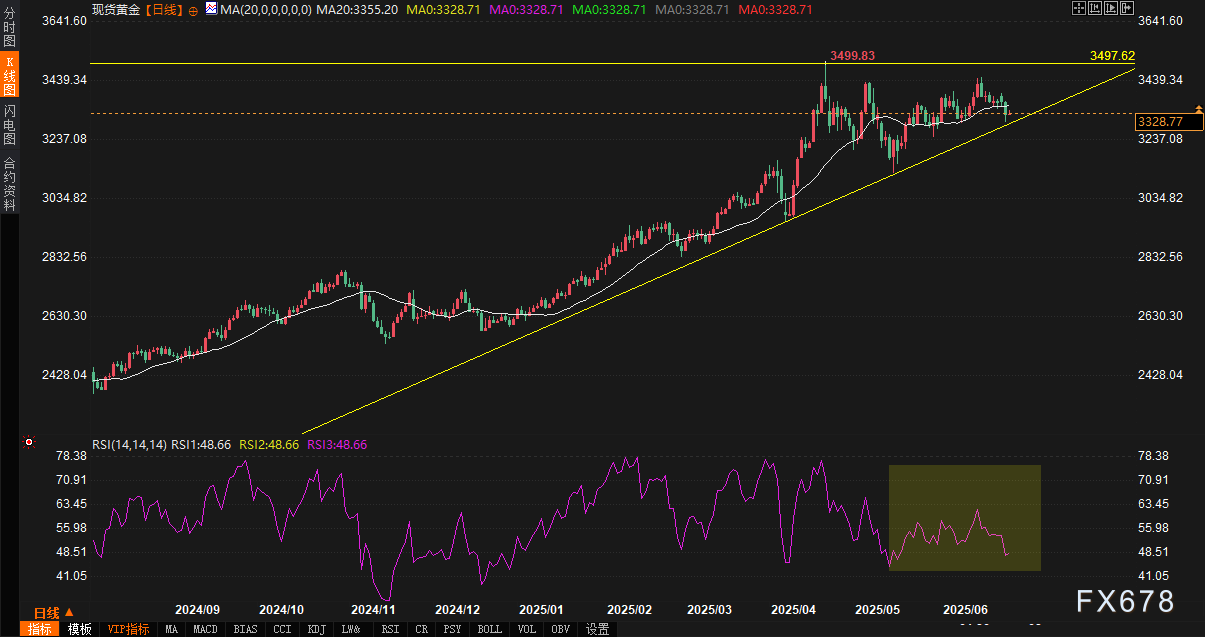 从日线结构看,金价仍处于上升三角形形态内,上沿阻力位于3500美元(4月22日高点),下沿支撑则由4月7日低点2957美元构成的趋势线提供。当前价格运行于20日均线下方,短期趋势偏弱,但尚未形成破位。