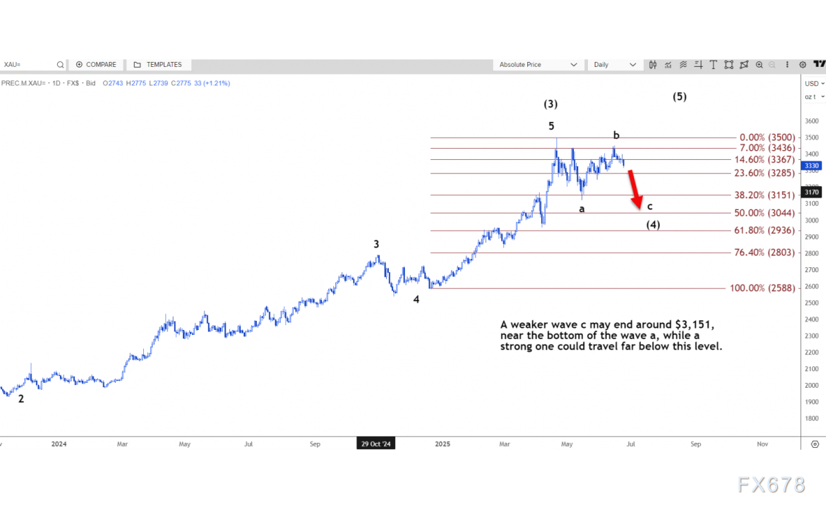 较弱的 c 浪可能结束于 3151 美元左右,接近 a 浪的底部,而较强的 c 浪则可能远低于该水平。