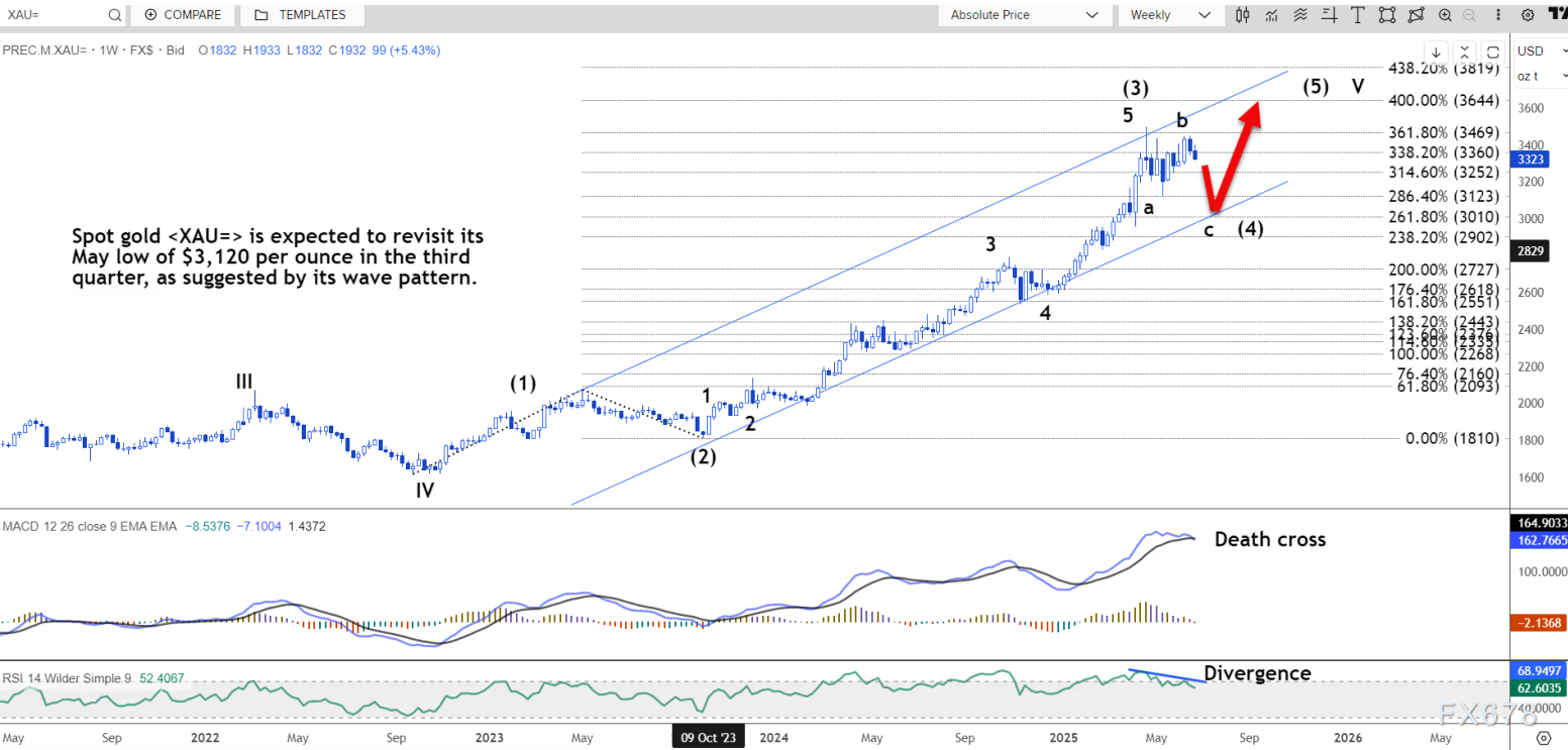 周线图上的信号表明此波将延伸至 3151 美元以下。