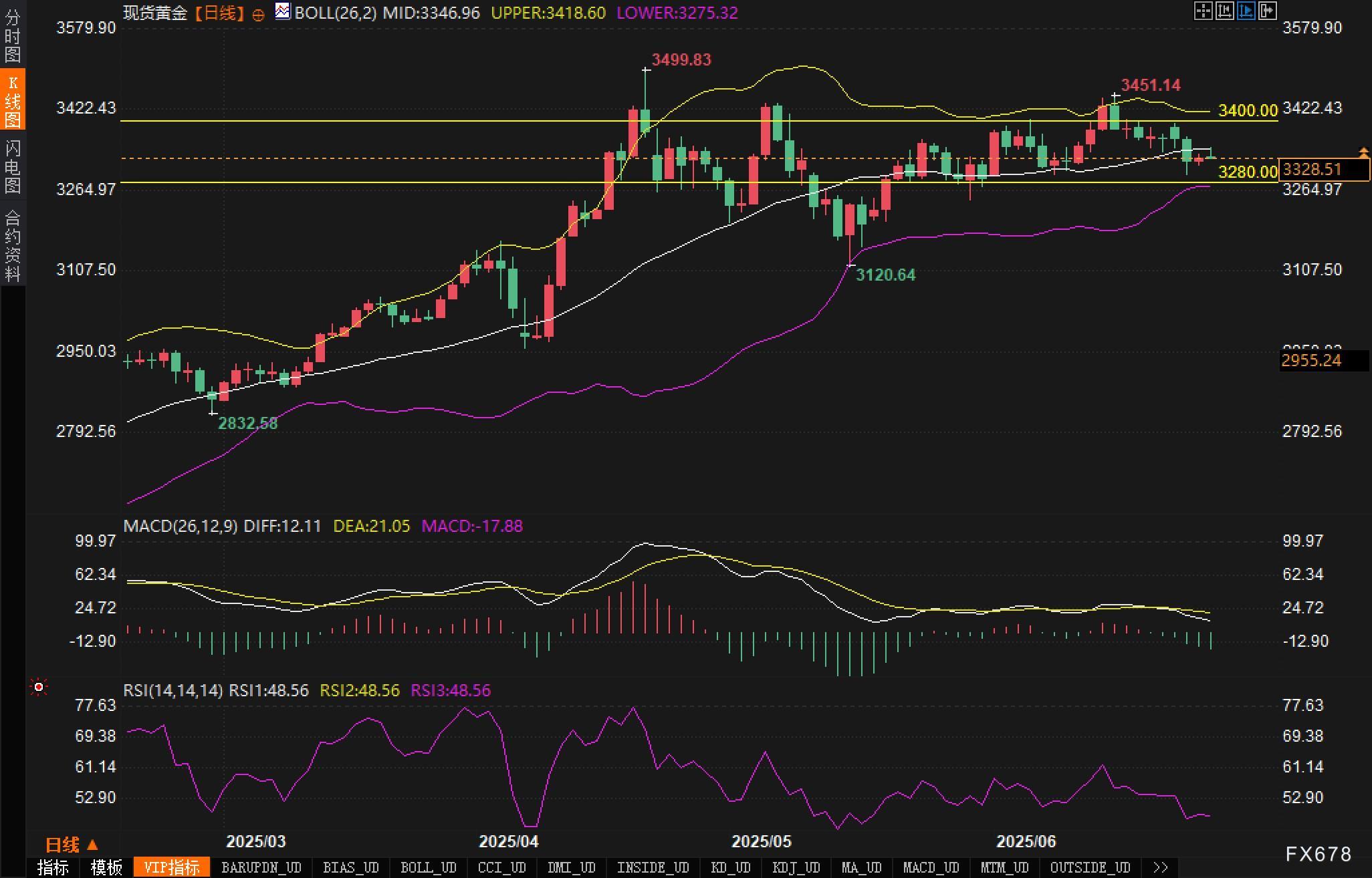 —现货黄金周四(6月26日)震荡整理,北美时段交投于3320美元附近。尽管全球市场风险偏好回升、美元略有反弹,但黄金价格下行空间有限,延续前期高位整理走势。