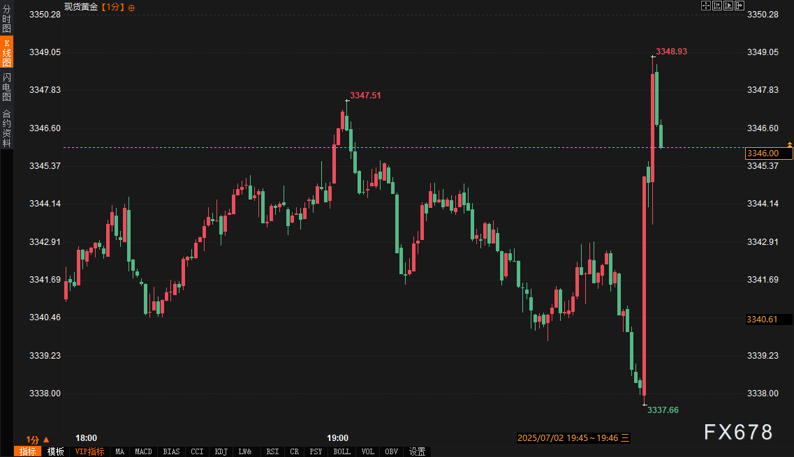 与此同时,挑战者企业裁员报告显示6月裁员人数为4.8万,月率下降48.84%,年率微降1.6%,较前值9.38万明显回落,显示裁员压力有所缓解。ADP数据公布后,美元指数短线急跌,黄金作为避险资产迅速走高。