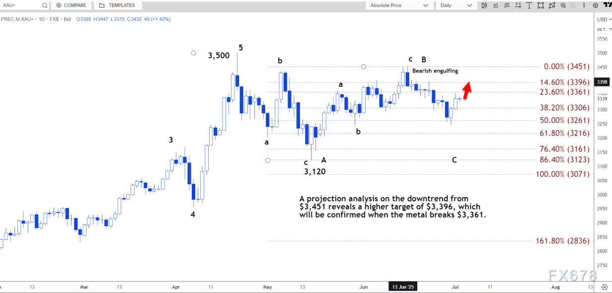 日线图上,对 3451 美元起的下行趋势进行预测分析,显示更高的目标位在 3396 美元,当金价突破 3361 美元时,这一目标将得到确认。