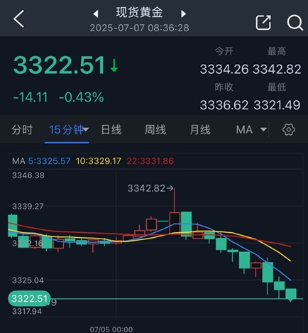 24K99讯 周一(7月7日)亚市早盘,现货黄金突然加速下滑,金价目前跌至3322美元/盎司附近,较稍早触及的日内高点3342.82美元/盎司回落20美元。