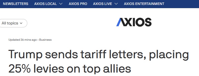美国Axios新闻网称,美国总统特朗普周一发出关税信,对主要盟友征收25%的关税。