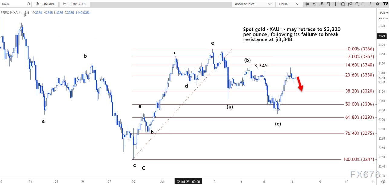 路透技术分析师指出,现货黄金未能突破 3348 美元的阻力位,可能回撤至每盎司 3320 美元。