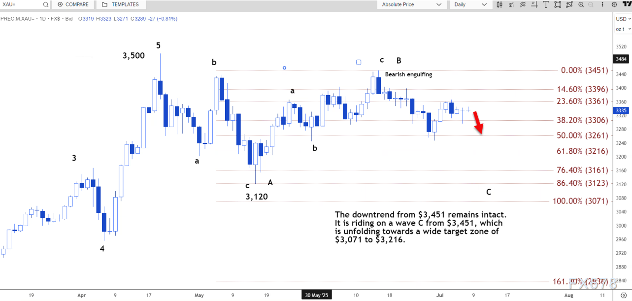 日线图上,自 3451 美元开启的下行趋势依然完好。目前,该价格正处于自 3451 美元开启的 C 浪上,该浪正朝着 3071 美元至 3216 美元的宽幅目标区域展开。