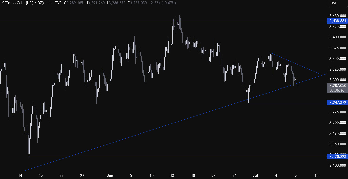 截至发稿,现货黄金下跌0.4%,至3,285美元,此前触及6月30日以来最低点3282美元。