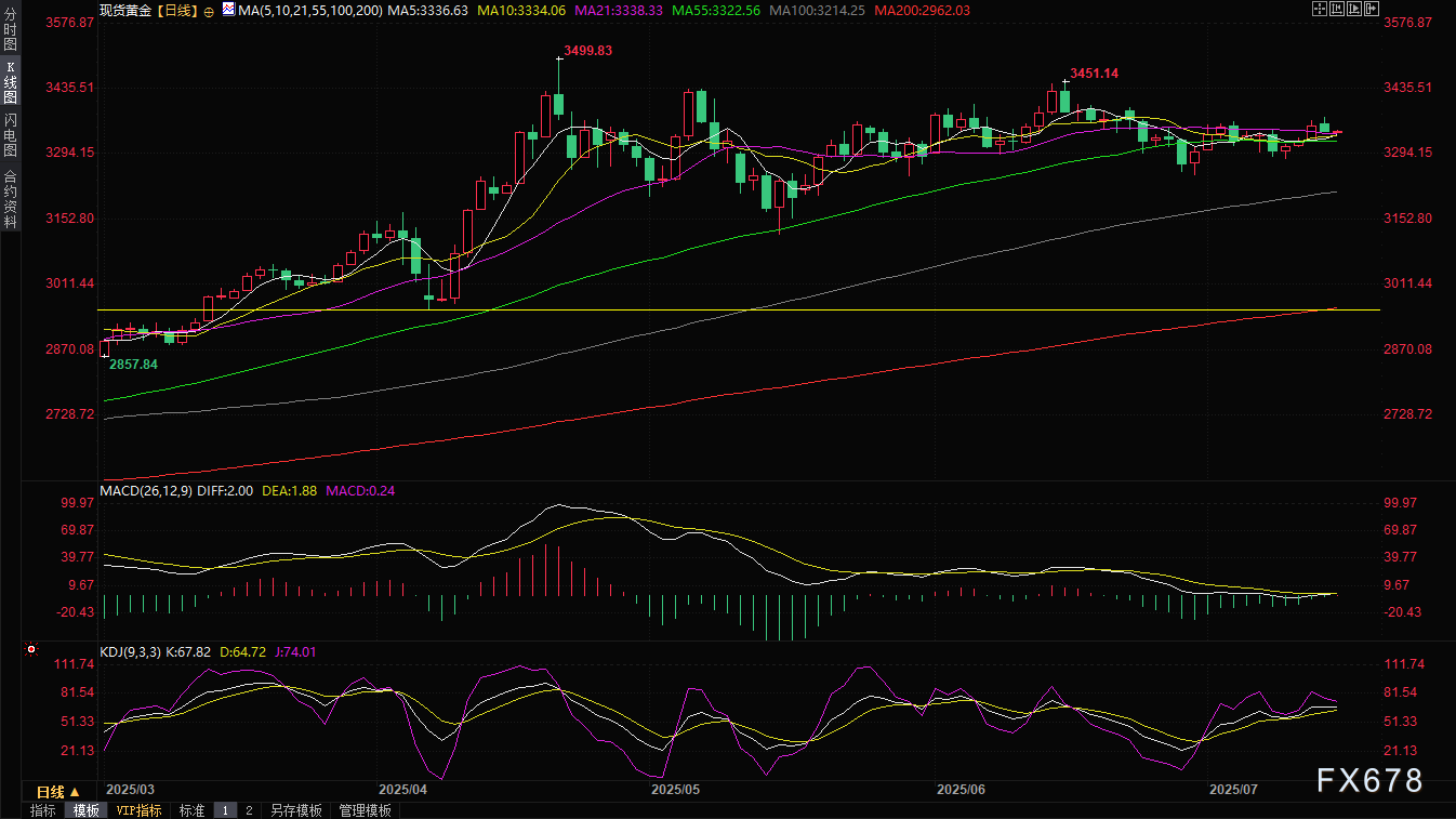周二(7月15日)亚洲时段,现货黄金窄幅震荡,目前交投于3345.22美元/盎司附近。金价在周一上演了一出惊心动魄的"过山车"行情,因特朗普宣布8月1日对欧盟加征关税,现货黄金价格在周一早盘一度冲高至3374.78美元/盎司,创下自6月23日以来的三周新高,让多头投资者欣喜若狂。然而欧盟并未立即强硬报复,并表示仍有谈判的空间,市场担忧情绪有所降温,而且美元指数强势反弹至三周高位,美债收益率也同步攀升至一个月高位,金价震荡回落,最终收报3343.31美元/盎司,日内跌幅约0.4%。本交易日将出炉美国6月CPI数据,投资者需要重点关注。
