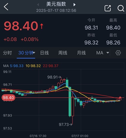 受该消息影响,美元指数自日内高点98.91暴跌,最低跌至97.73。现货黄金自3320美元/盎司附近水平飙升,最高触及3377.48美元/盎司。