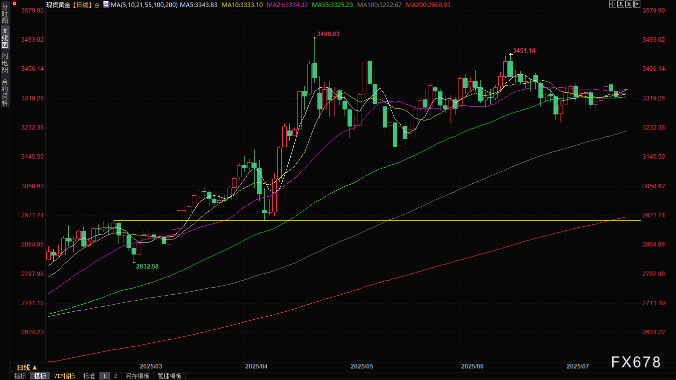 周三(7月16日)黄金市场经历了一场戏剧性波动。纽市早盘因美元走强,金价一度跌至3319.58美元/盎司的日内低点,但随后彭博一则“特朗普考虑解雇美联储主席鲍威尔”的报道瞬间点燃市场避险情绪,金价狂飙逾50美元,触及3377.17美元的三周高点。然而,剧情再度反转——特朗普迅速否认解雇计划,金价涨幅收窄至0.68%,最终收报3347.38美元。周四(7月17日)亚市早盘,现货黄金窄幅震荡,目前交投于334650美元/盎司附近。