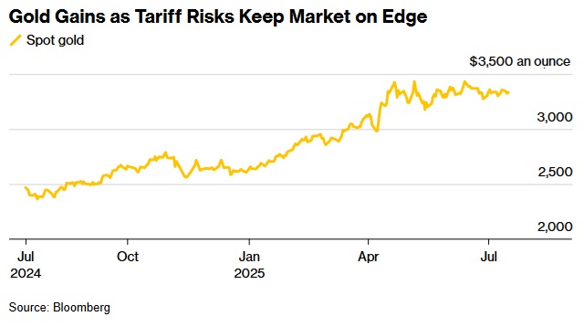 过去几个月,金价一直在相对窄幅区间波动,今年迄今仍上涨逾25%。贸易紧张局势和地缘政治冲突的后果引发担忧,加上大量资金流入交易所交易基金(ETF)和各国央行,均支撑了金价。