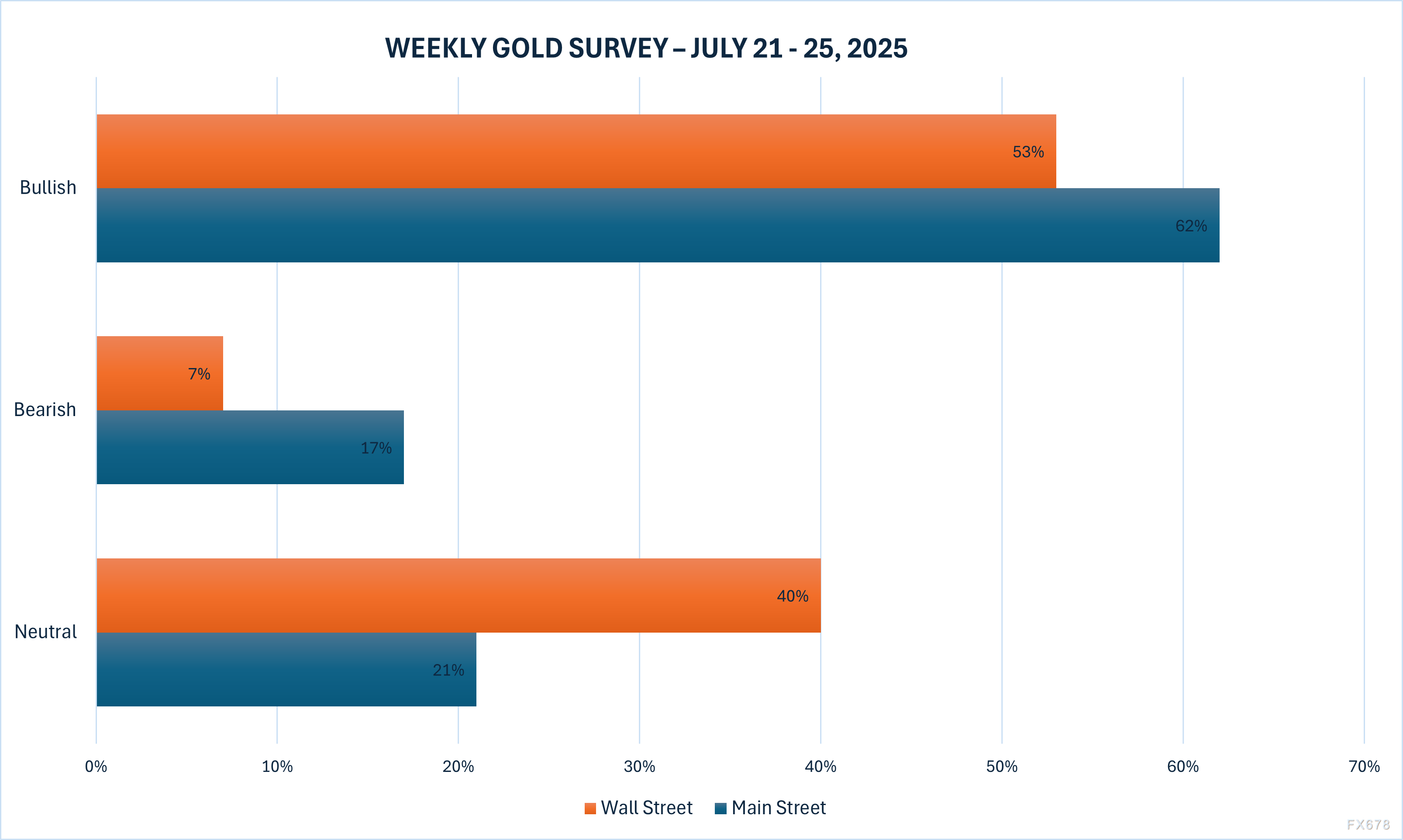 根据Kitco新闻的周度黄金调查,15位华尔街分析师中,53%预计未来一周金价将上涨,40%认为将继续横盘,仅7%看跌。与此同时,223位散户投资者的民意调查显示,62%预计金价上涨,21%认为将盘整,17%预计下跌。这一结果表明,零售投资者在一周的疑虑后重新恢复看涨倾向。