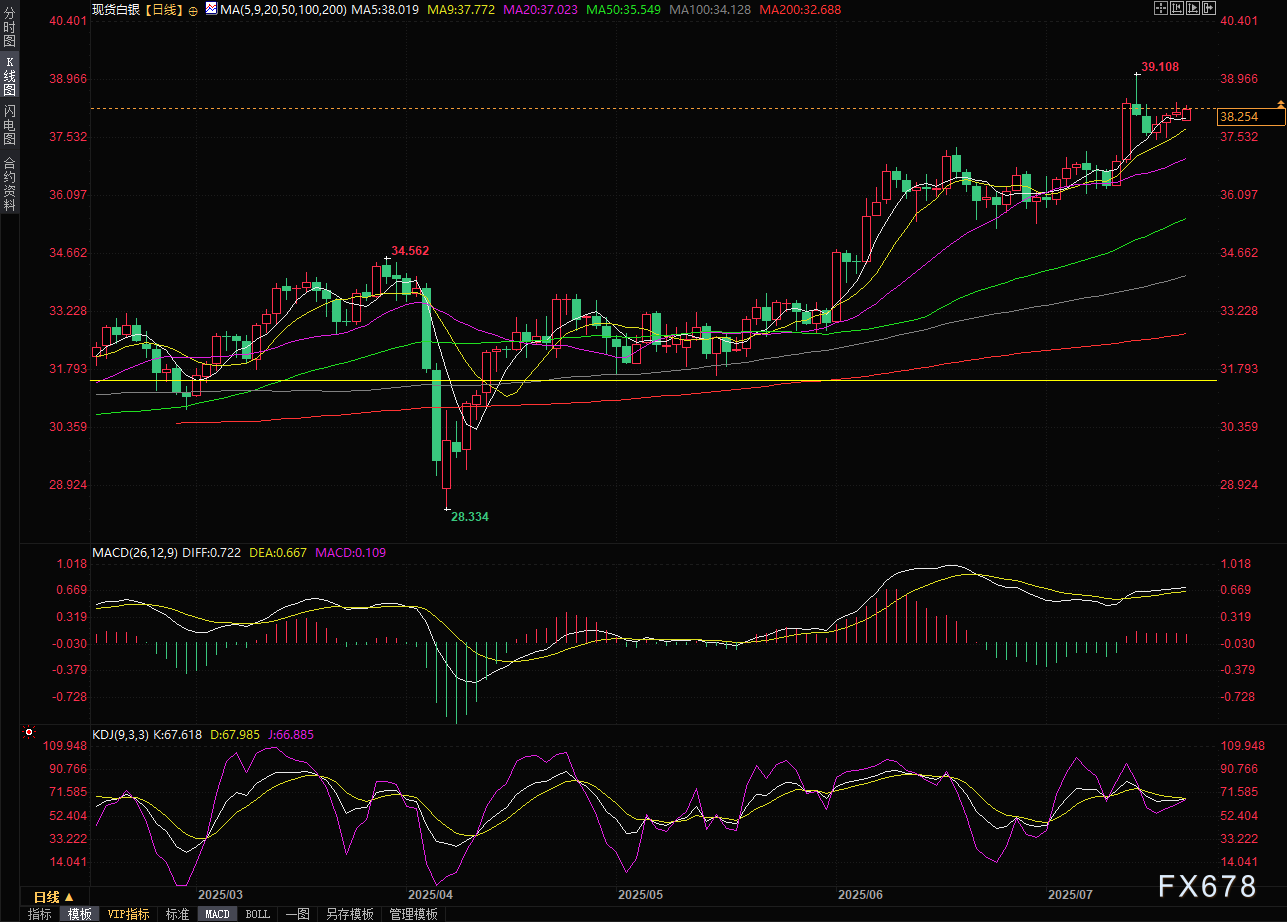现货白银在亚洲时段周一(7月21日)震荡微涨,目前交投于每盎司 38.29美元附近,延续前一交易日微跌后的盘整态势。