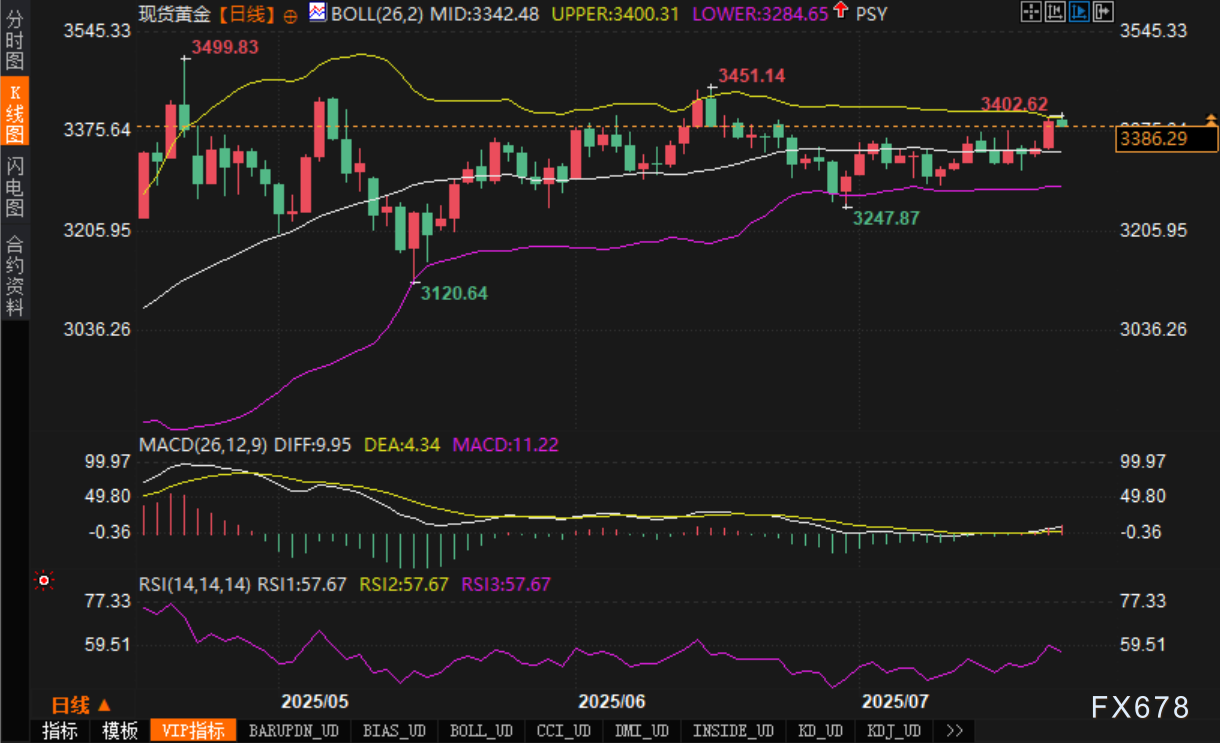 进入本周,现货黄金价格强势上涨,周一单日涨幅超过1%,一举突破盘整已久的3400美元/盎司整数关口。近期触及3402.62美元,创下五周新高。7月22日周二,黄金报价欧洲时段小幅调整至3385美元附近。