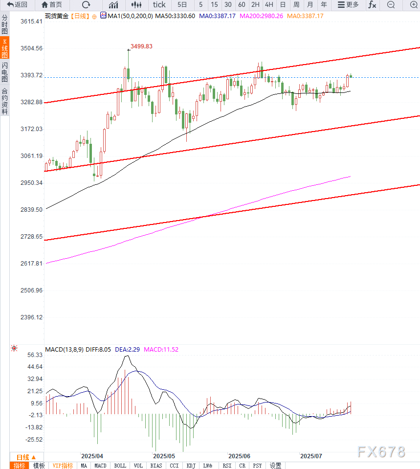 短期阻力位于3452美元(三个月高点),若突破该水平,有望进一步上探历史高点3500美元,甚至通道上轨3630美元。