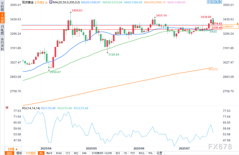 周三(7月23日),黄金价格小幅走低,早间一度冲高至3439.04美元,但多头未能突破6月16日高点3451.53美元,随后回落。在接近历史高位区间的犹豫情绪,反映出投资者对在3500.20美元历史高点附近追涨的意愿日益减弱。