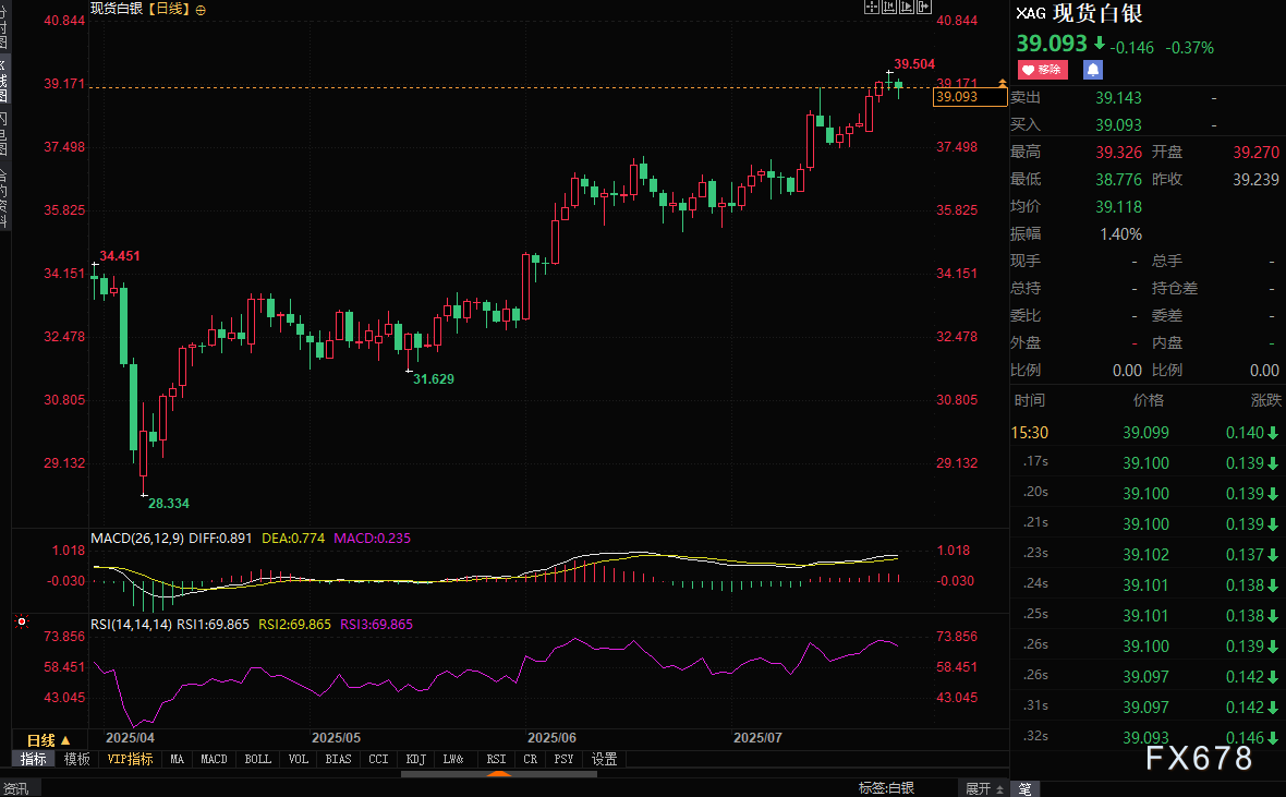 —周四(7月24日)亚欧时段现货白银震荡下跌约0.4%,目前交投于39.07美元/盎司附近,近期走势强于黄金,Macd,Rsi位置处于看涨区间。