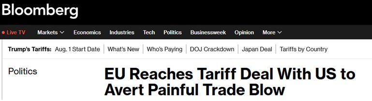 FX168财经报社(亚太)讯 当地时间周日(7月27日),美国总统特朗普(Donald Trump)表示,美国已与欧盟达成贸易协议,对欧盟输美商品征收15%的关税。美国彭博社称,这避免了一场可能对全球经济造成沉重打击的贸易战。