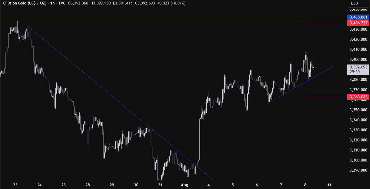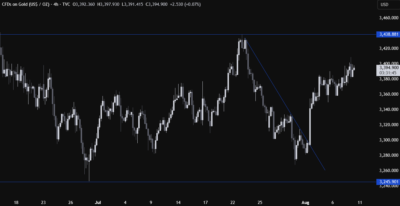 从日线图来看,黄金在非农数据推动的自 3,245 美元支撑位反弹后,正在缓慢走高,逼近 3,438 美元一带的关键阻力位。如果价格到达该位置,预计卖方会再次在阻力区入场,并在该水平上方设置止损,目标是推动价格回落至支撑位。而买方则会等待突破阻力,以加码看涨押注并冲击新的历史高位。