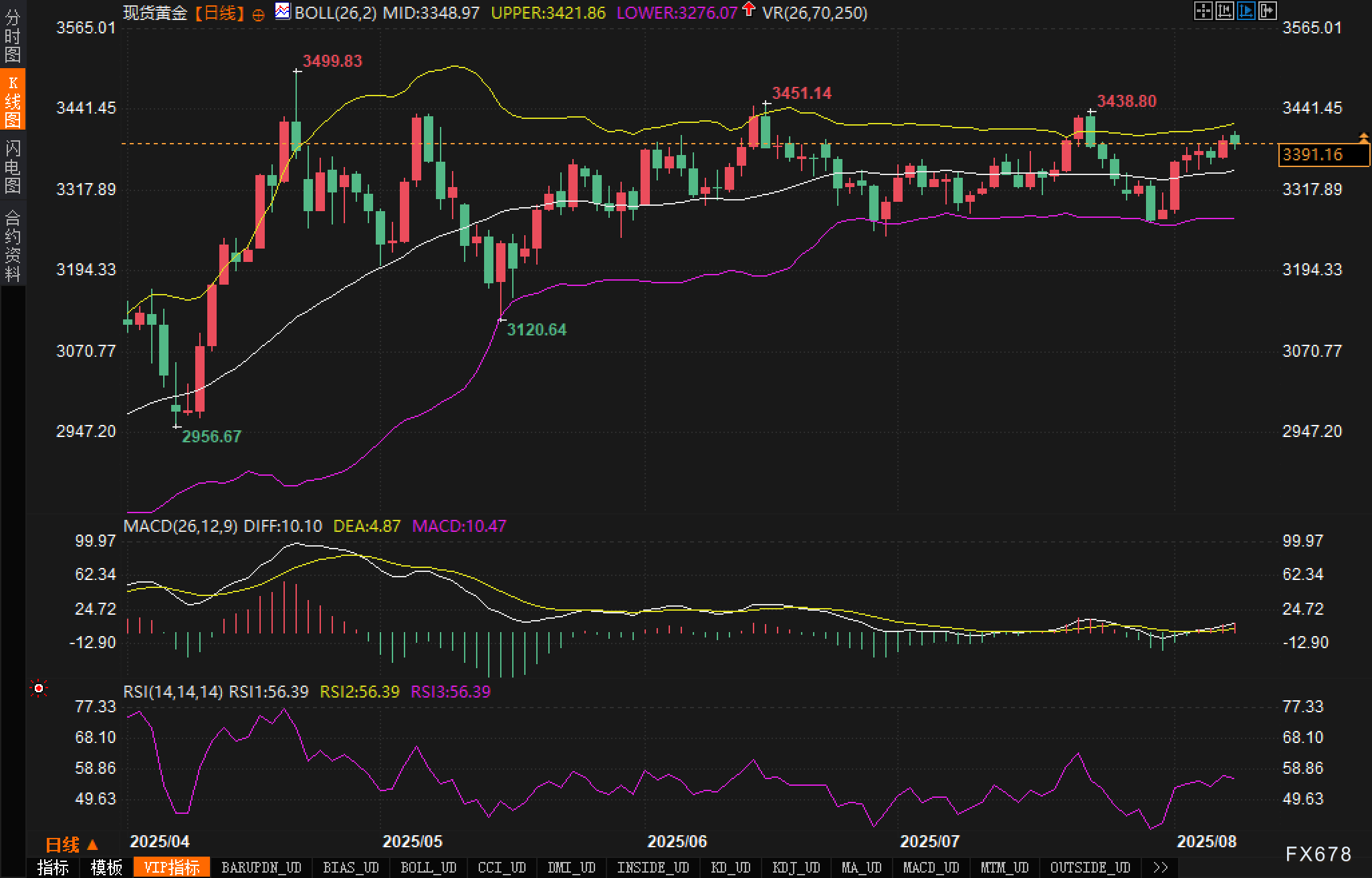 从日线图看,布林带中轨3348.97、上轨3421.86、下轨3276.07。现价3391.16位于中轨与上轨之间,属于上行通道内的回撤。价格触及3400上方未能有效突破,3420一线的水平压制与3438.80/3451.14两处前高构成了密集阻力带,更上方还有历史高点簇拥,包含3499.83的针尖高位。