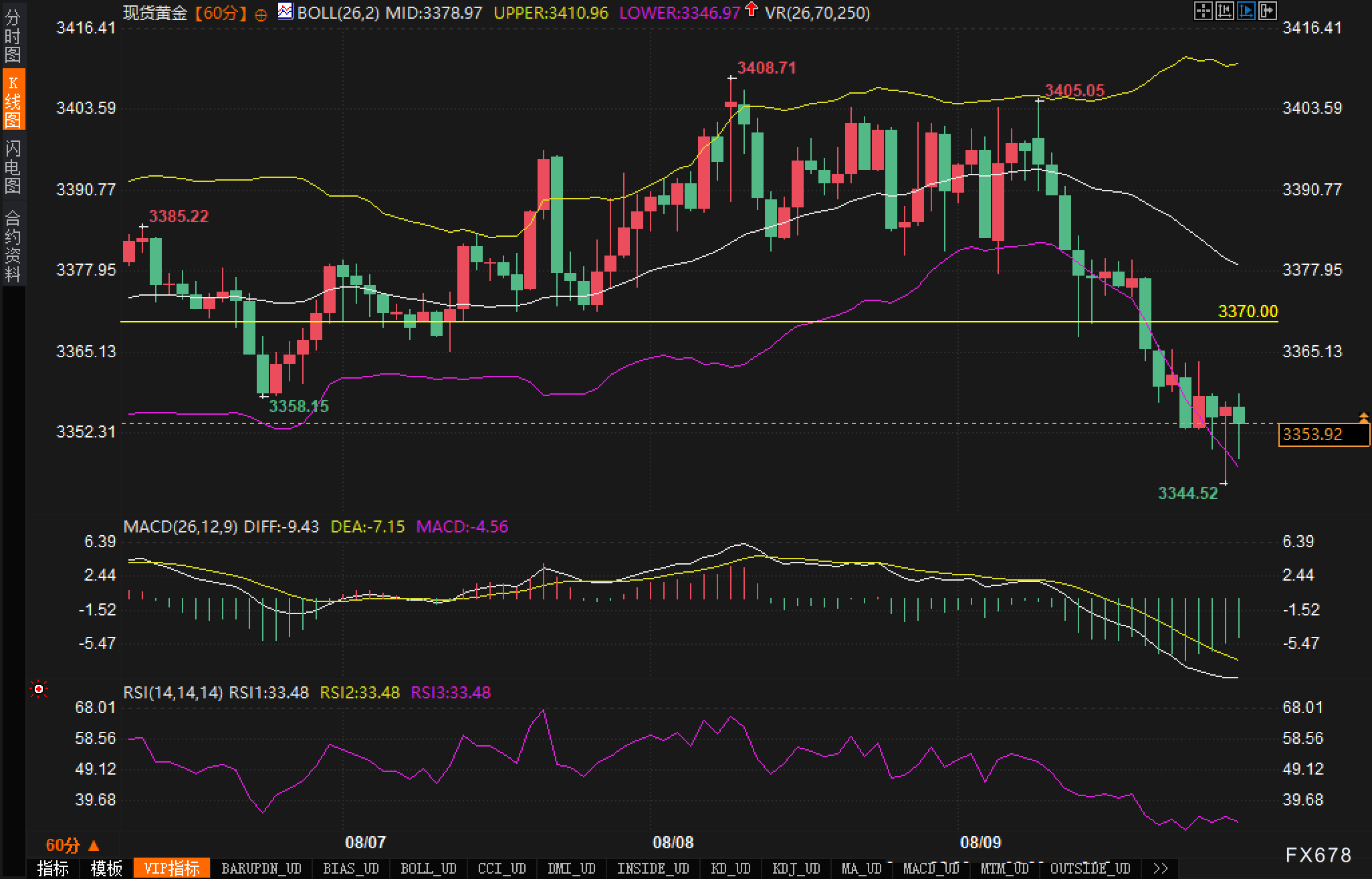 价格近期在3405.05/3408.71形成双重高点后一路走低,布林中轨3378.97被有效下破并转化为压制;最新K线贴近布林下轨3346.97游走,带宽较前期明显走阔,指向趋势性下行而非单纯的横向震荡。盘中重要水平清晰:前高下方的结构位3385.22与横向枢轴3370.00构成第一道上方阻力带;若反抽至中轨附近,3378.97与上轨下沿的空档对多头不友好。下方支撑方面,分别是布林下轨3346.97与近期低点3344.52;更早的台阶低点3358.15已被跌穿,短线供给上移,压制有效。