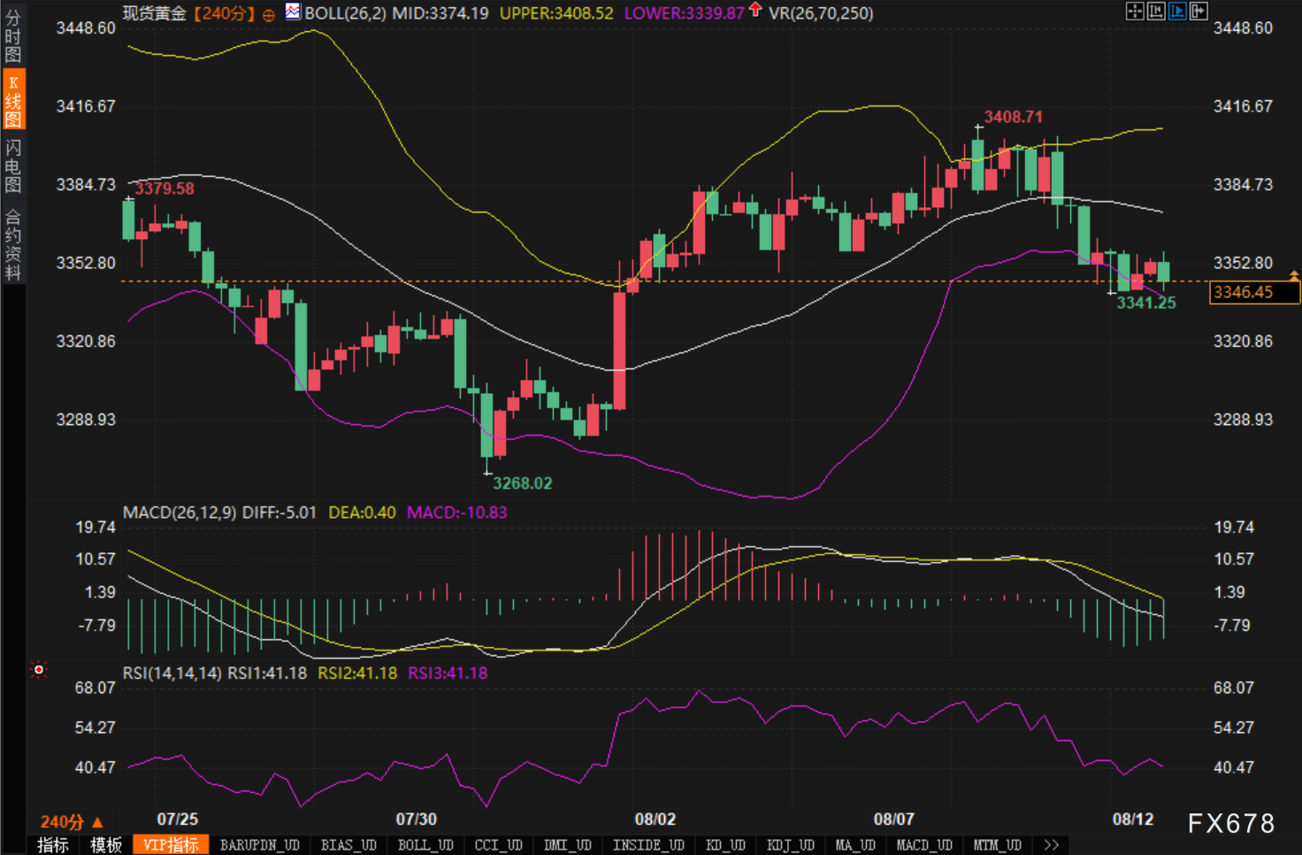 从技术角度观察,黄金现货正面临关键的技术分水岭。当前价格位于布林带中轨3374.19美元下方,显示短期承压态势。布林带上轨3408.52美元构成重要阻力位,而下轨3339.87美元为近期支撑。价格在布林带中下轨区间运行,反映出市场情绪偏向谨慎。