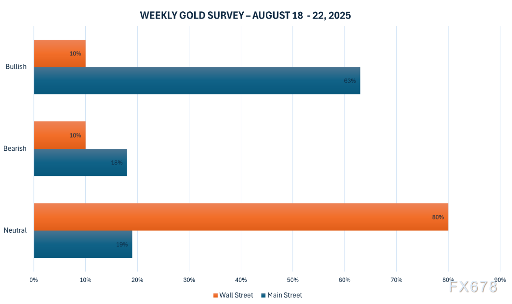 最新的Kitco新闻每周黄金调查显示,华尔街与散户投资者对黄金价格的预期存在显著差异。华尔街分析师中,80%(8位)预计未来一周金价将继续横盘整理,仅10%(1位)看涨,另10%(1位)看跌,反映专业投资者对短期趋势的谨慎态度。相比之下,散户投资者的乐观情绪更为强烈,在183票的在线民调中,63%(115人)预计金价上涨,18%(33人)看跌,19%(35人)认为将维持盘整。这种分化表明散户对黄金的长期看涨信心未受近期市场波动影响。