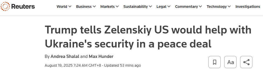 FX168财经报社(亚太)讯 英国路透社周二(8月19日)最新报道称,美国总统特朗普(Donald Trump)当地时间周一告诉乌克兰总统泽连斯基(Volodymyr Zelenskiy),美国将在结束俄罗斯在乌克兰战争的任何协议中帮助保障乌克兰的安全。但路透社称,援助的程度目前尚不清楚。