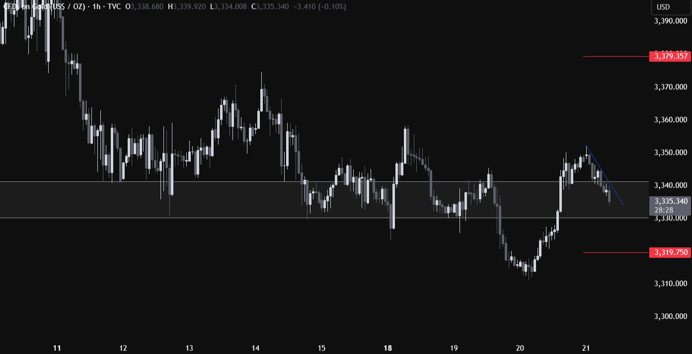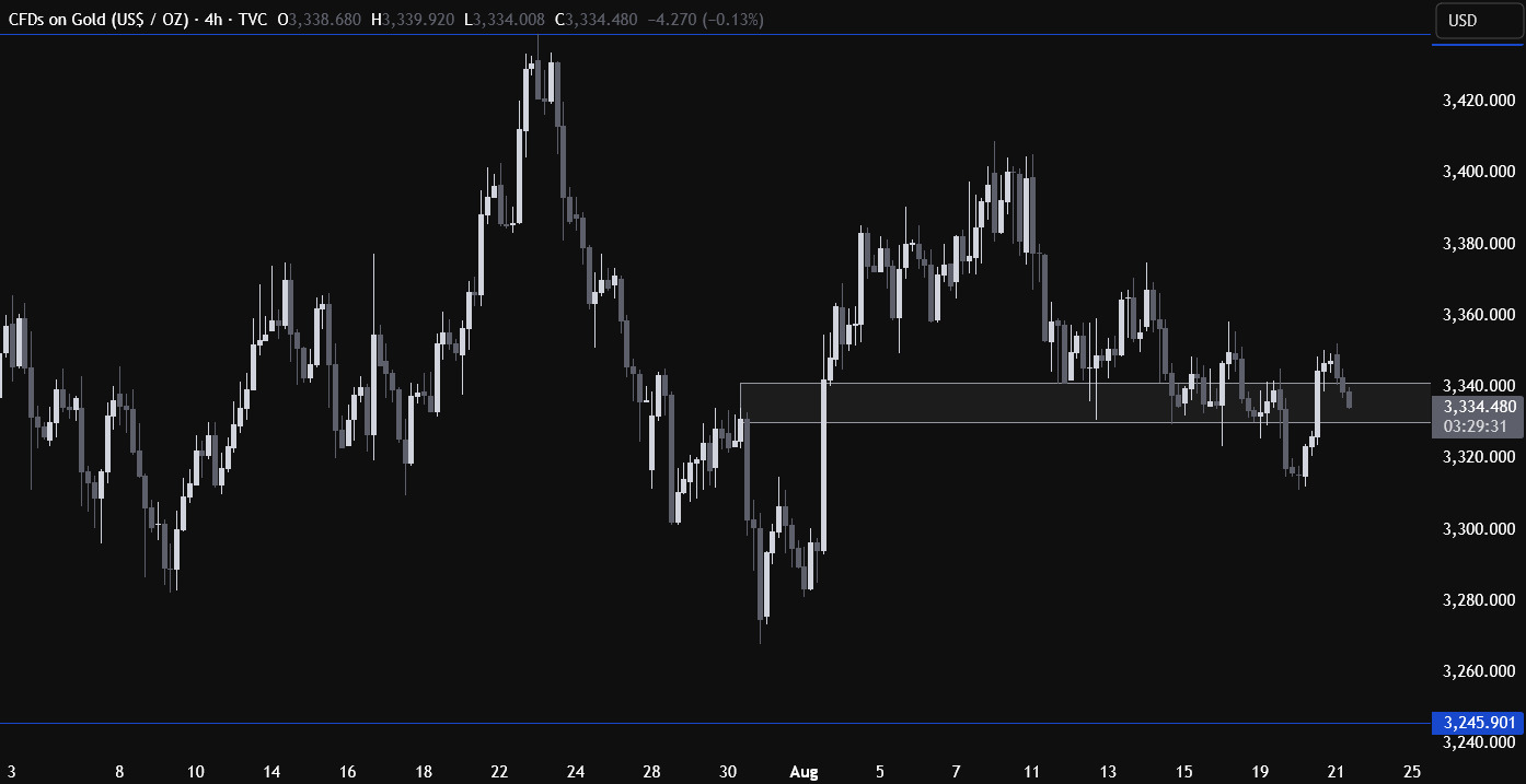 在4小时图上,可以看到在3,330附近存在一个小型支撑区域。价格近期曾下探该区域,但随后又反弹回到其上方。买方可能会继续在该区域附近进场,风险控制在支撑下方,目标则是冲击3,438阻力。卖方则希望看到价格再次跌破支撑,以推动金价进一步下探至3,245水平。