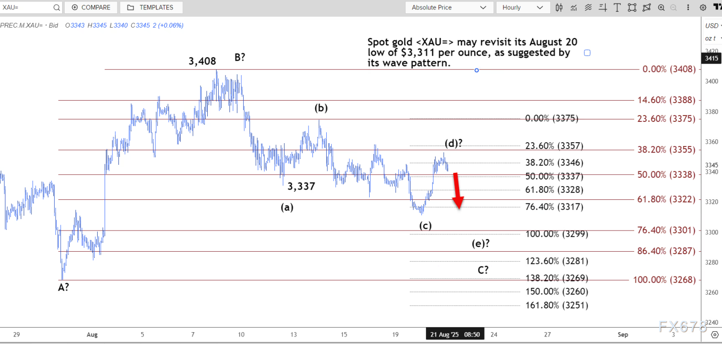 路透技术分析师指出,现货黄金可能重新回到 8 月 20 日的低点 3311 美元/盎司,正如其波浪形态所暗示的那样。