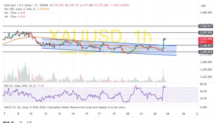 Kitonyi写道,周五,金价从约3320美元/盎司的日低反弹至约3373美元/盎司。在60分钟的图表中,金价也完成了从下行通道的向上突破。